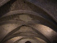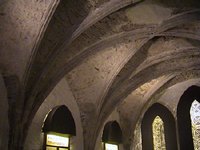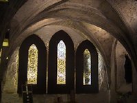 The Chapter House is the sole remaining part of the complex and dates from 1190. It used to be possible to lease it for meetings and it was here at a meeting of the Privy Council in 1534 that Silken Thomas Fitzgerald started his rebellion against the king. After hearing of his fathers execution, he flung down his sword of state and marched out to raise an army. Subsequently it transpired that his father had not been executed. The Chapter House consists of a simple vaulted chamber with single light gothic windows in the west façade, now obscured by large clumsy light fittings mimicing windows.