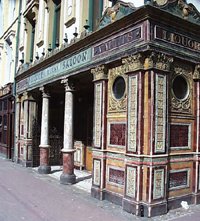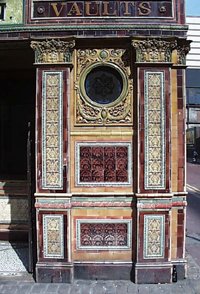 The interior was built by a local firm in 1885 who in 1898 clad the exterior in faience and tiles. The exterior façade of the bar is a riot of polychromatic tiles and colour.