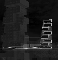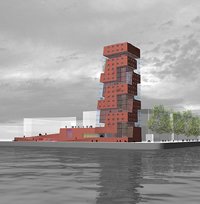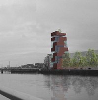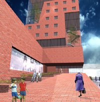 This building also derives its structure from a loop, which carves through a brick tower and provides a 'street' for both the residents and the public. The street unifies all the functions within the building, from the public terraces to the commercial offices, from the nightclub to the front gardens, from your apartment to U2's studios. It provides circulation, social interaction, gardens, natural lighting and a high spatial quality. The massive form of the tower has the physical presence of a city landmark, while the 'street' that wraps itself around it gives it a human scale.